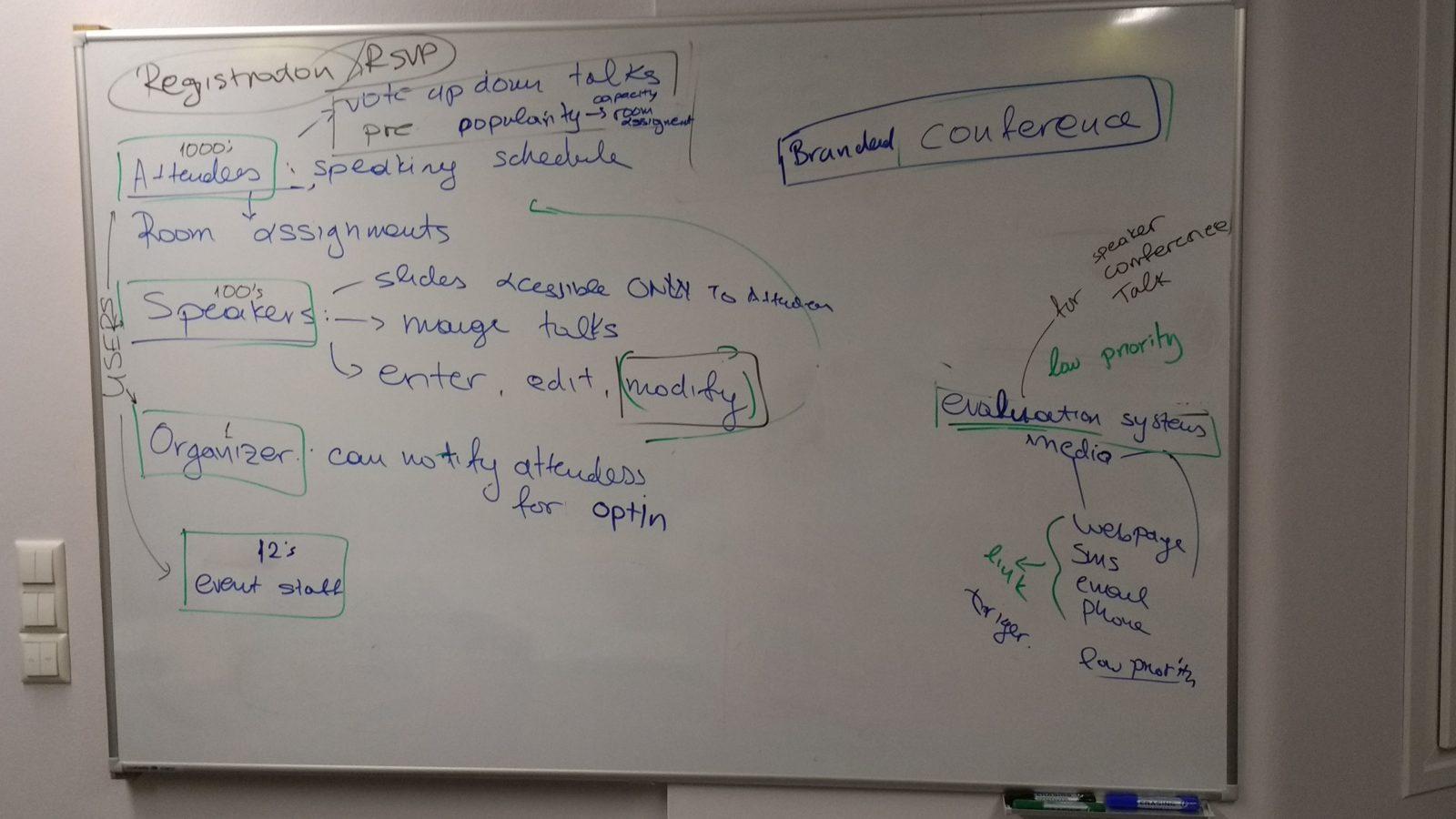 Each group is given a project (in many ways, an RFP–Request For Proposal) that needs development. The project team meets for a while, discovers requirements that aren’t in the orignal proposal by asking questions of the “customer” (the Moderator), discusses technology options that could work, and sketches out a rough vision of what the solution could look like.