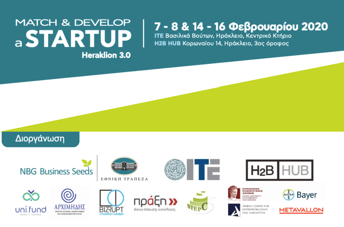 Το Πρόγραμμα NBG Business Seeds της Εθνικής Τράπεζας της Ελλάδος, το Δίκτυο Πράξη του ΙΤΕ, το Επιστημονικό και Τεχνολογικό Πάρκο Κρήτης του ΙΤΕ, το H2B HUB, ο οργανισμός Bizrupt, το Athens Center for Entrepreneurship and Innovation (ACEin) του Οικονομικού Πανεπιστημίου Αθηνών, το Κέντρο Αρχιμήδης του Εθνικού Καποδιστριακού Πανεπιστημίου Αθηνών, το Uni.fund, το Metavallon και η Bayer ενώνουν τις δυνάμεις τους και σε προσκαλούν στο μεγαλύτερο startup-bootcamp στην Κρήτη, το Match and Develop a Startup Heraklion 3.0.